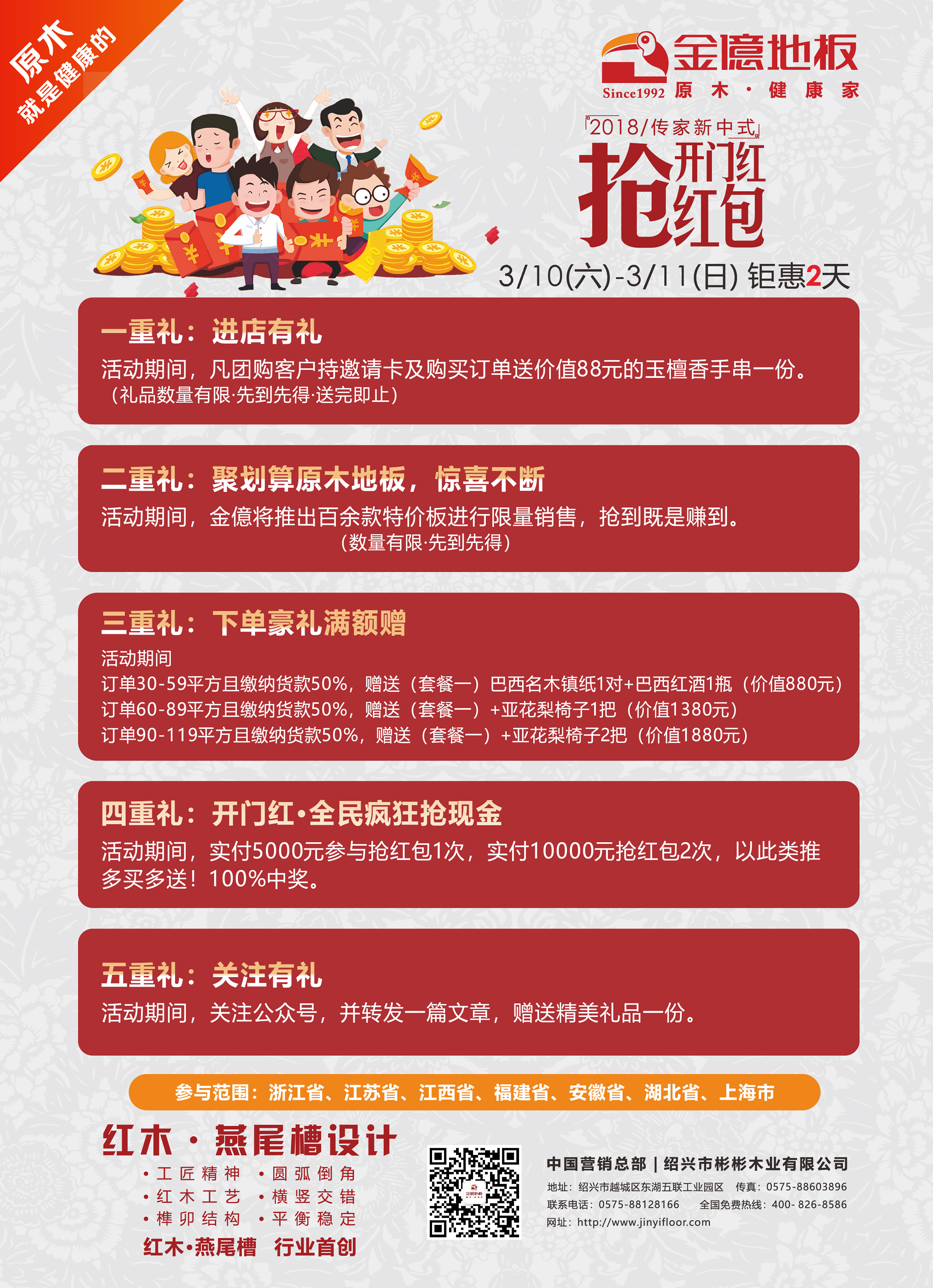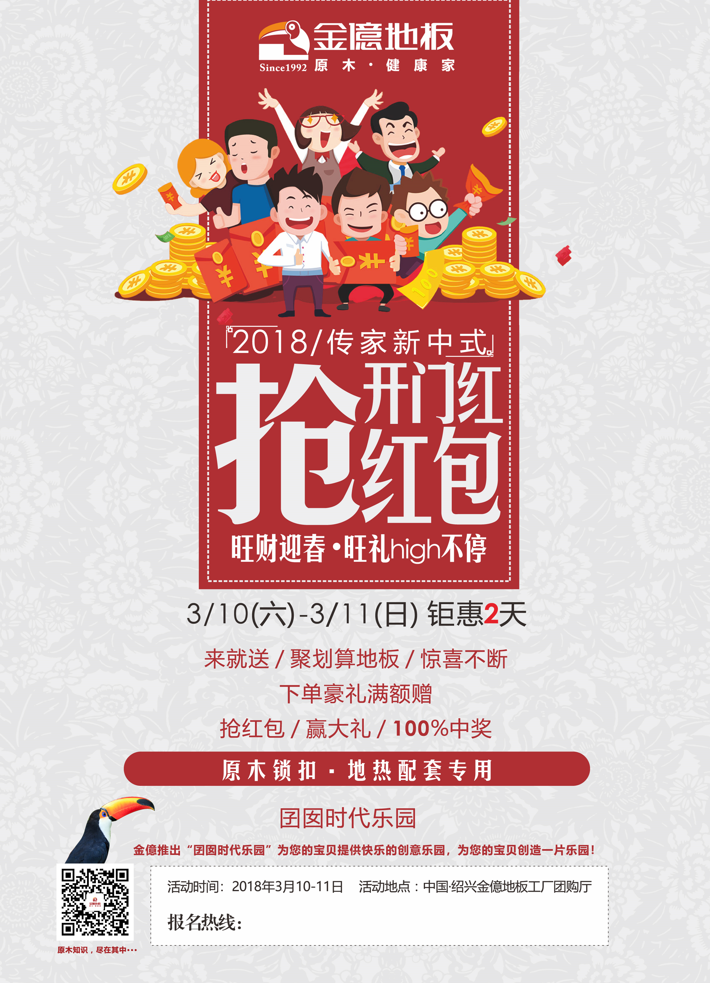 时间一晃而过,过完了热热闹闹的春节,我们又迎来了新的一年工作之中。2018年,撸起袖子,加油干! 3月九州(中国)地板工厂团购活动 “开门红-抢红包 旺财迎春,旺礼high不停” 如约而至。