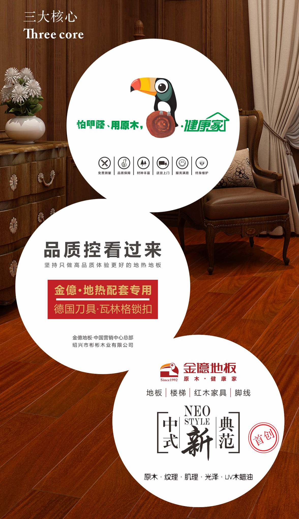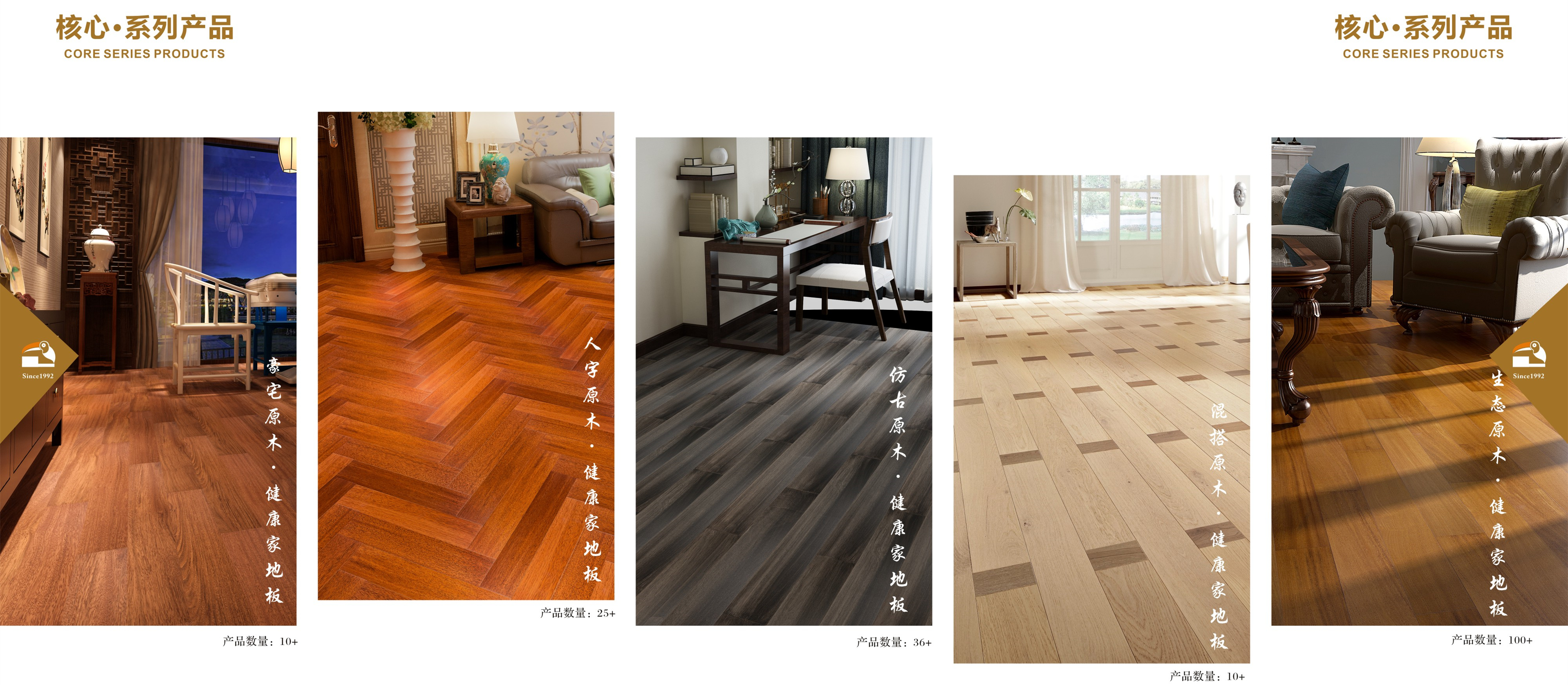 木材领域走出国门、迈向世界,森林资源遍布南美洲、非洲、东南亚 南美洲购买260万亩森林采伐权的中国地板企业 实木地板每片产品都经过42道工序精工细琢而成 引进欧洲U型槽锁扣自动化生产设备 自主研发绒膜消声防水地板技术,获得国家实用新型专利证书 自主研发豪宅背板燕尾槽结构设计,地热配套专用 对孪叶苏木、香二翅豆、重蚁木、饱食桑、紫芯苏木等南美核心材种拥有话语权 首推“原木健康家”地板,拒绝甲醛,健康地板让家人更放心 投资兴建国字号“中国木业博物馆”(总高度80米) 三大核心